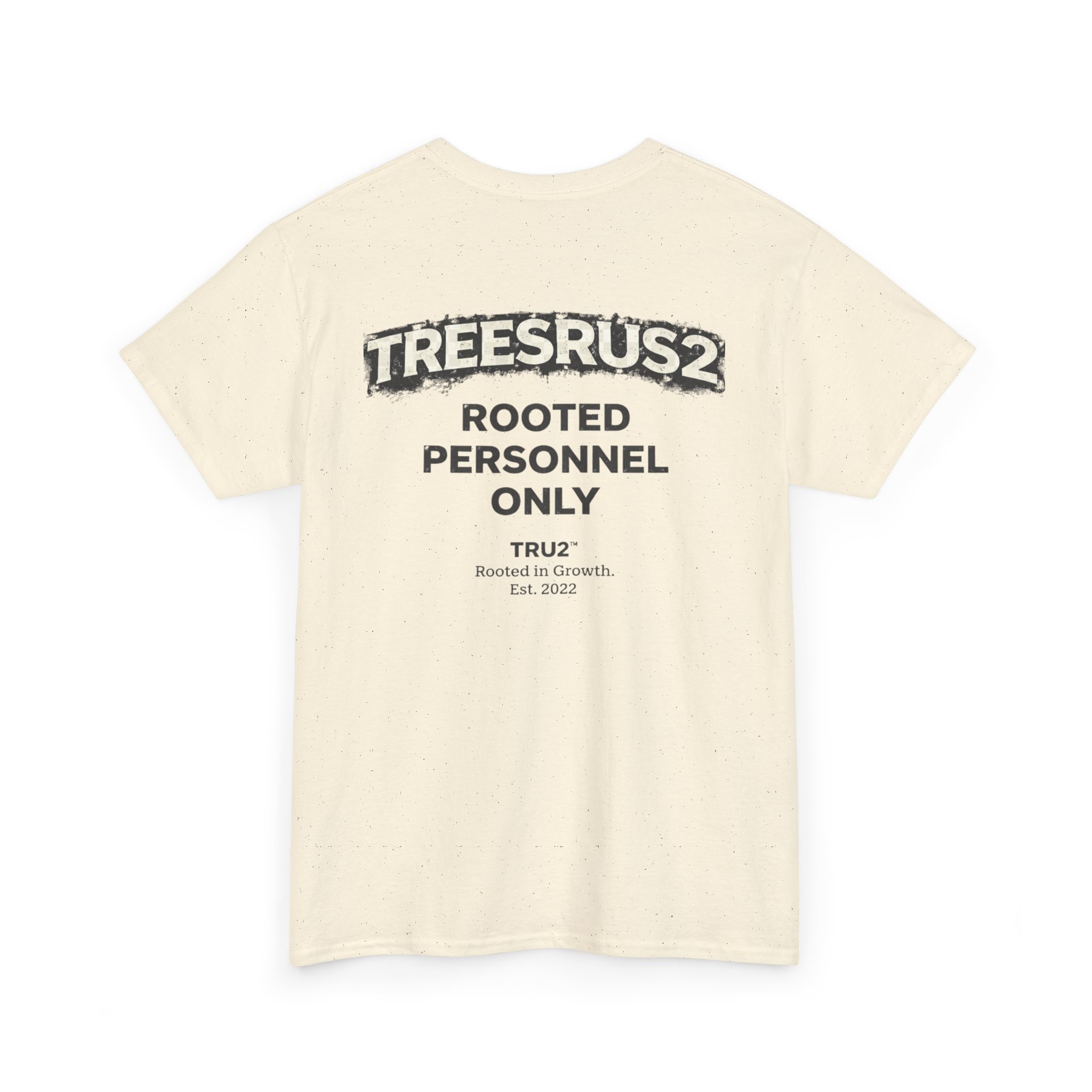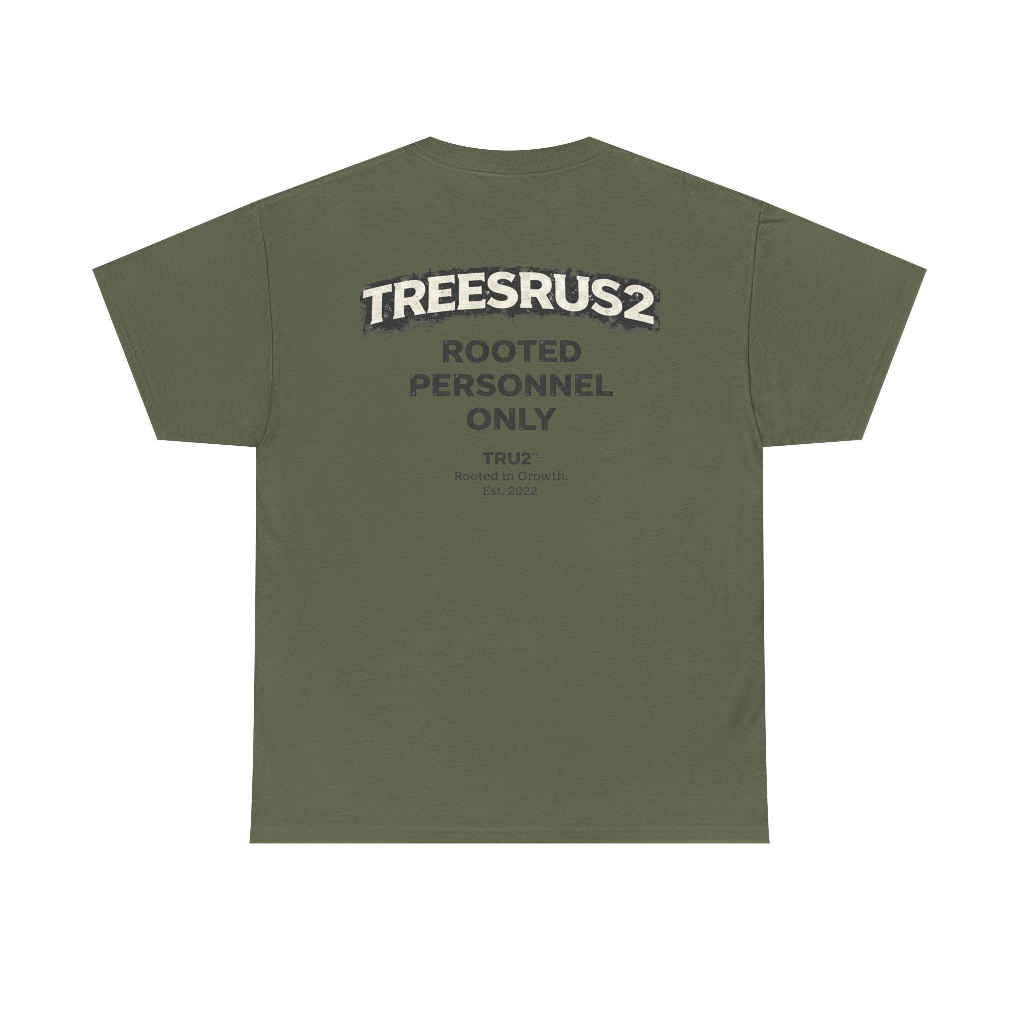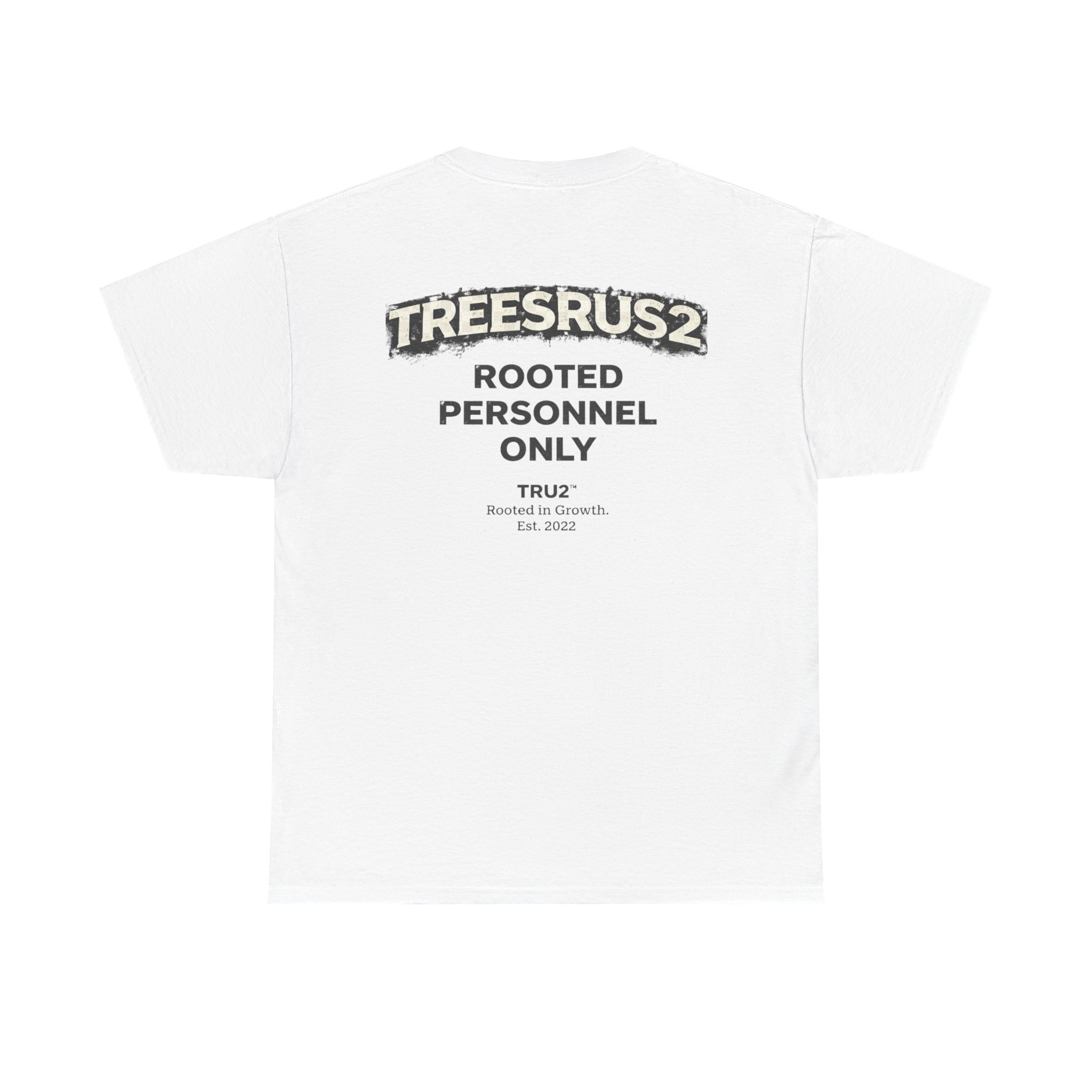 TreesRUs2 Rooted Personnel Only Tee. Clean front, bold back graphic, and durable cotton build. Made for those who stay grounded.